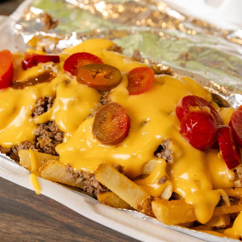 Crispy fries topped with grilled steak, grilled onions & cheese sauce garnished with hot cherry peppers